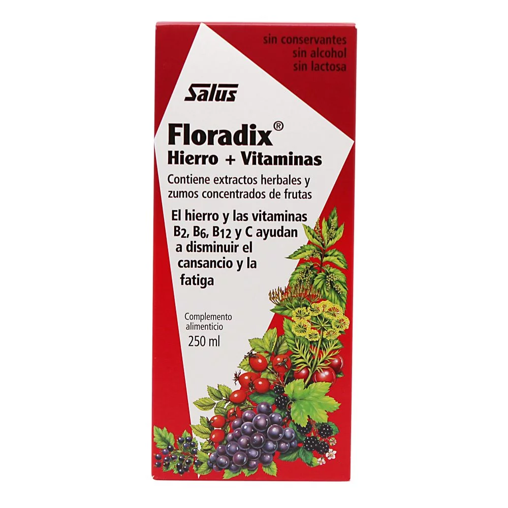 Floradix Composición: Extracto acuoso de zanahorias, ortigas, espinacas, raíces de grana, raíces de angélica, hinojo, algas marinas, flores de hibisco, corteza de naranja. Contenido de frutas de pera, uva negra, grosella negra, naranja,limón, zarzamora, cerezas y remolacha. Extracto de levadura Saccharomyces cerevisiae, miel, gluconato ferroso, extracto de germen de trigo, vitaminas C, B1, B2, B6, B12, extracto de escaramujo y esencias naturales.